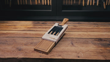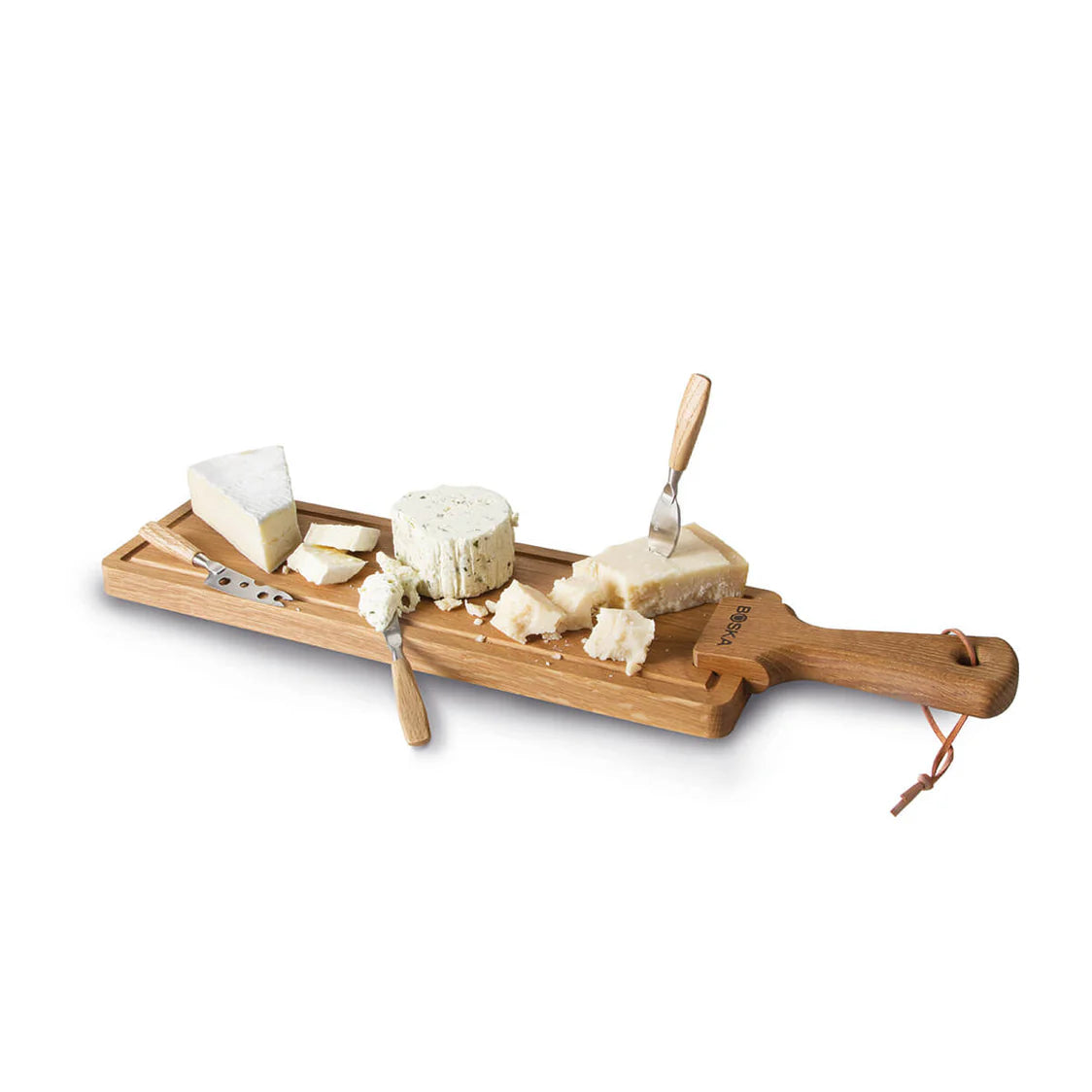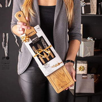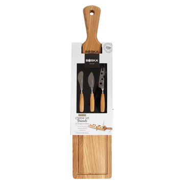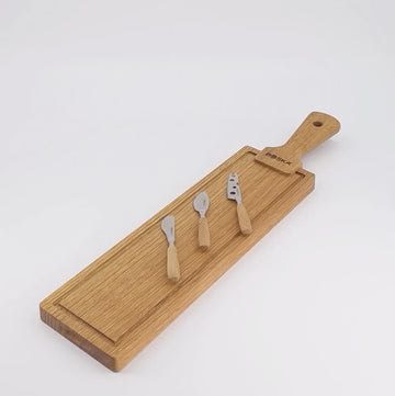 Setul dat este alegerea ideală pentru oricine iubește mesele în compania prietenilor. Setul conține un platou elegant realizat din lemn de stejar european de înaltă calitate și trei cuțite mici din oțel inoxidabil, fiecare conceput pentru tipuri diferite de brânzeturi. Datorită mânerului practic și șnurului din piele, platoul poate fi agățat cu ușurință după utilizare.
