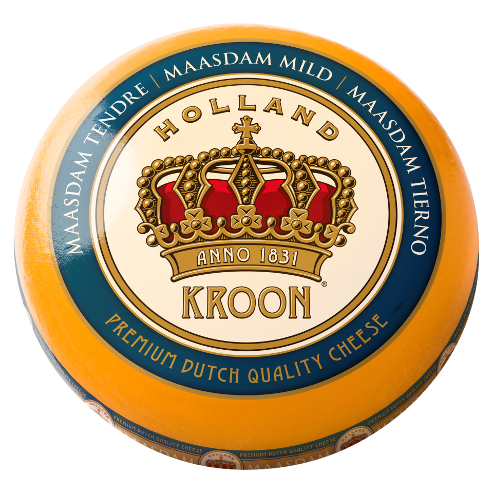 Cașcaval olandez tip Maasdam, cu textură moale și elastică și gust dulceag, delicat și ușor nucat. Ideal pentru platouri de brânzeturi, sandvișuri sau gratinare.