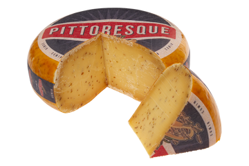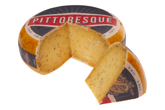 Un cașcaval Gouda maturizat, cu un conținut de grăsime de peste 50%, îmbogățit cu semințe întregi de chimen. Oferă o textură fină și un profil aromatic distinct, ușor nucos și condimentat.