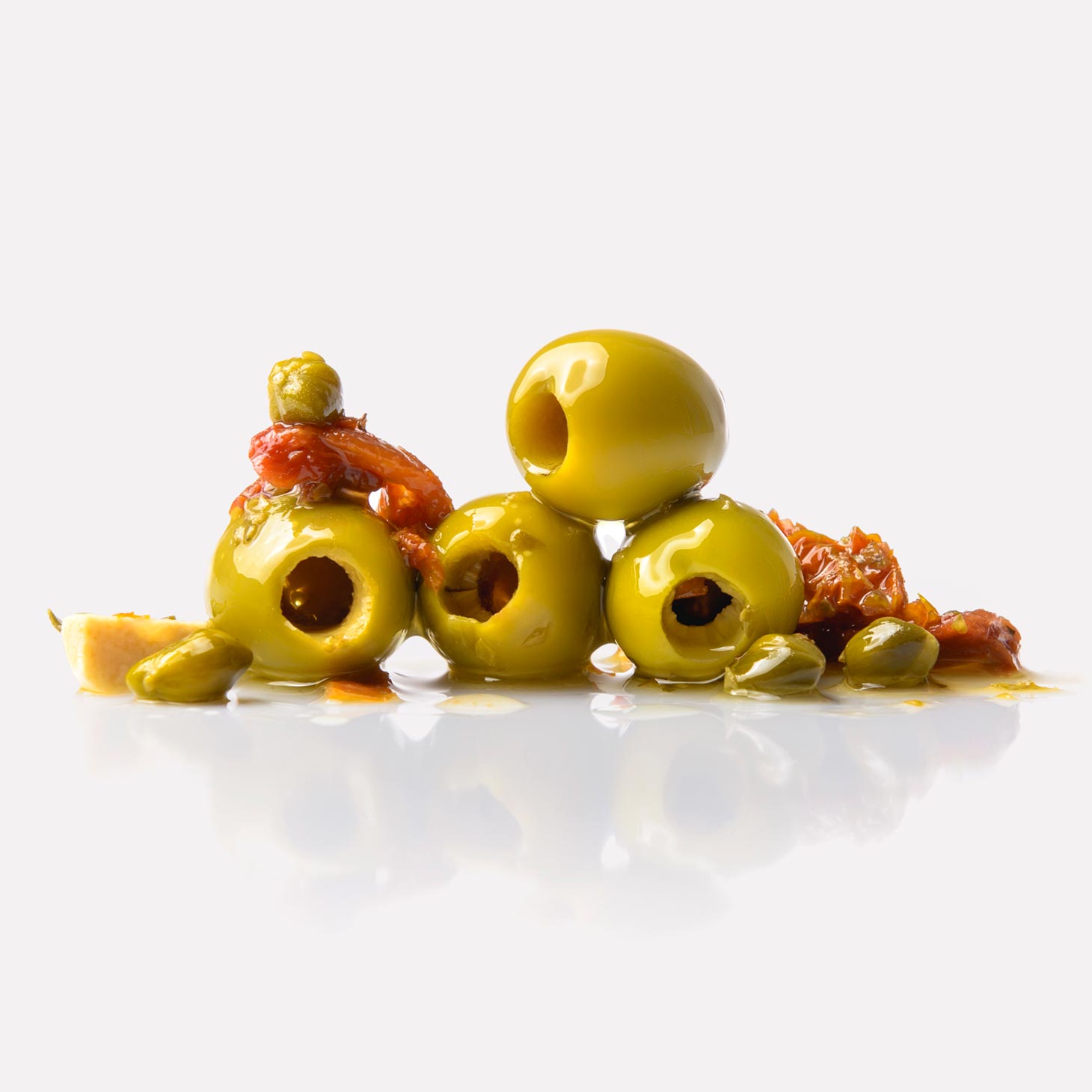 Măsline verzi, roșii uscate, capere, ardei iute, sare, ulei de măsline, potențiator de aromă: Monoglutamat de sodiu (E-621), acidulant: Acid citric (E-330), conservant: Sorbat de potasiu (E-202), antioxidant: Acid ascorbic (E-300)