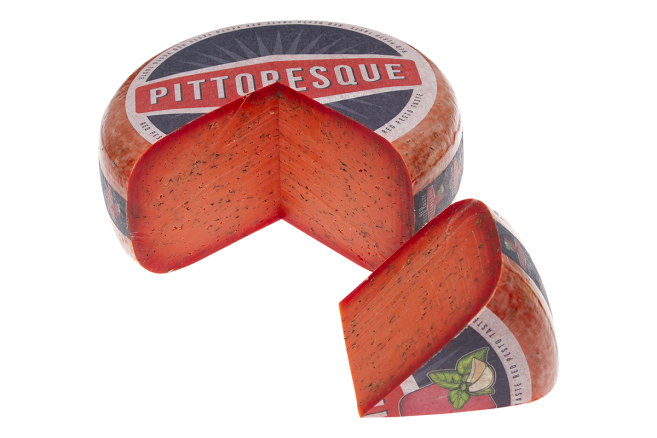 O brânză Gouda cremoasă, cu o culoare roșiatică distinctivă, infuzată cu ingrediente mediteraneene: roșii uscate, busuioc și usturoi (pesto roșu). Oferă un gust vibrant și o notă vizuală spectaculoasă.