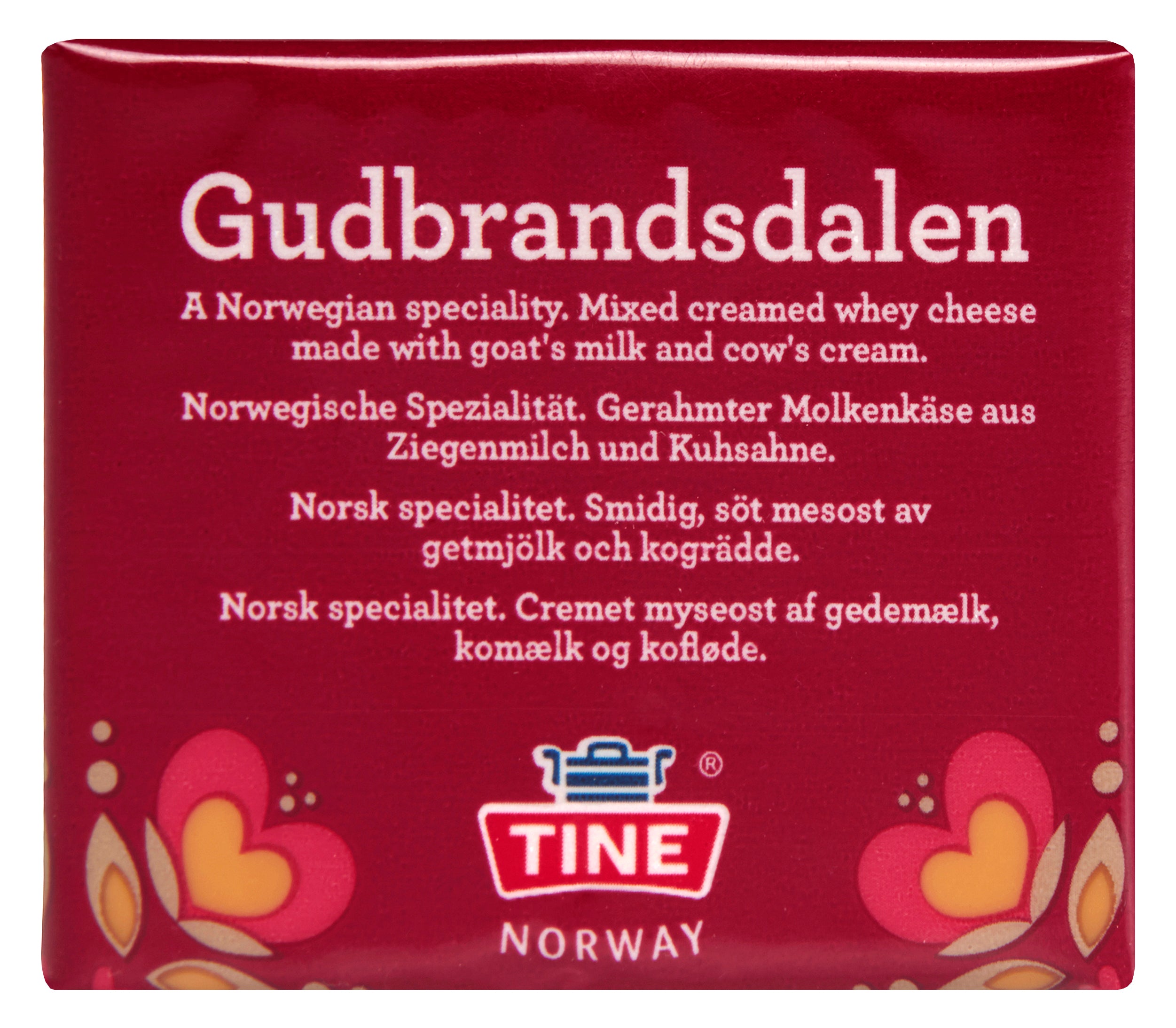 Gudbrandsdalen este o brânză emblematică norvegiană, produsă de TINE din zer de lapte de vacă și capră, fiert lent până la caramelizare naturală. Are o culoare brun-aurie, textură fermă, dar ușor tăioasă, și un gust dulce-sărat, cu note intense de caramel și lapte. Se potrivește perfect pe pâine, waffles norvegiene sau în combinații surprinzătoare cu fructe și cafea.
