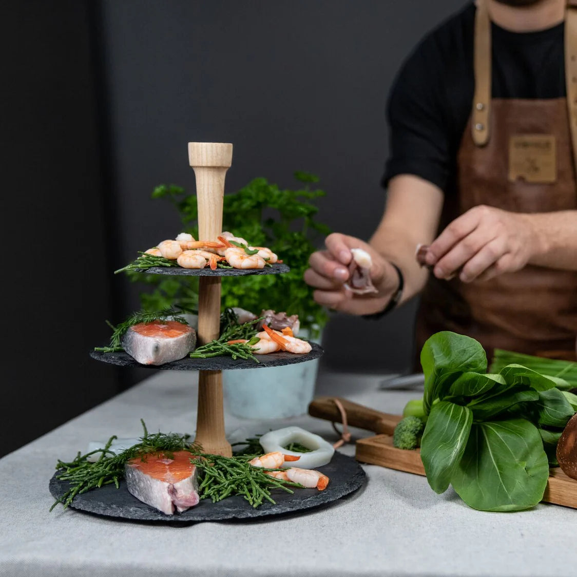 Party Tower® — это идеальная многоярусная стойка для элегантной демонстрации сыров, шоколада и других закусок. Сочетание высококачественного европейского дуба и сланцевых тарелок делает эту стойку по-настоящему эффектным украшением любой вечеринки, чаепития или праздничного стола. Благодаря трем ярусам вы можете комбинировать различные деликатесы.