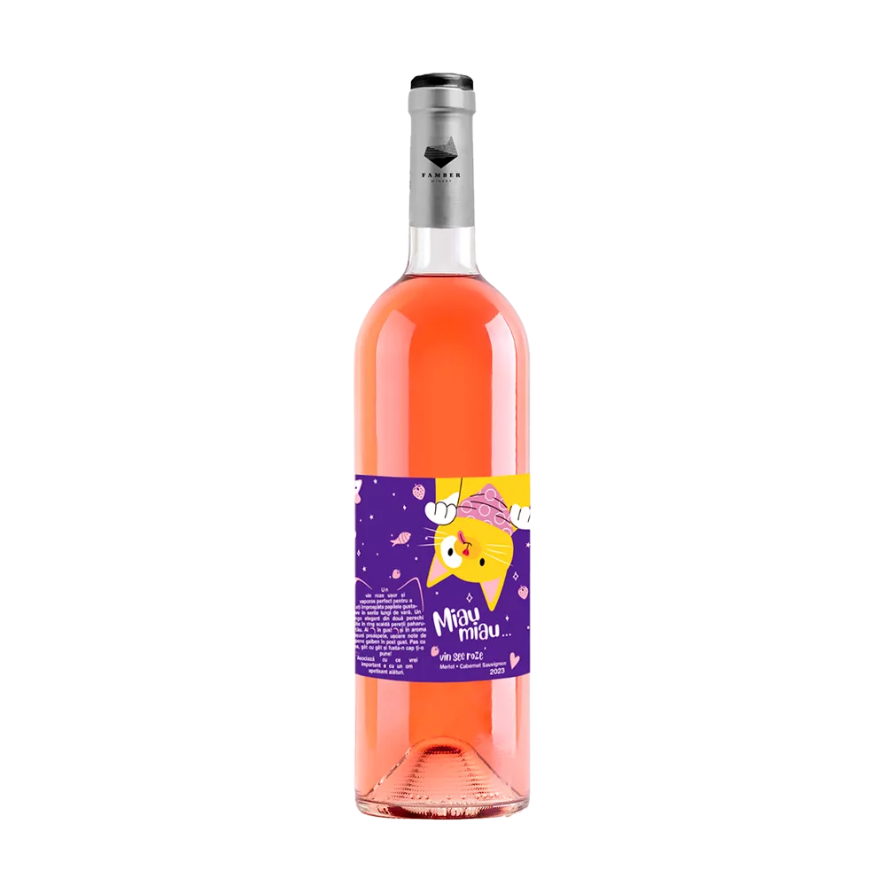Famber Roze “Miau Miau” — vin roze tânăr, aromat, cu note de căpşuni şi flori. Gust fin, perfect pentru momente vesele şi prietenoase.